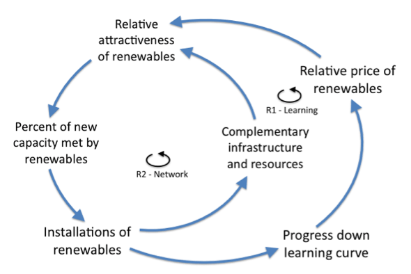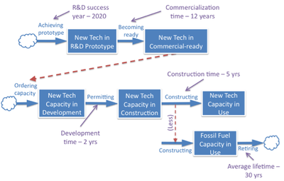 The ClimateWorks Foundation originally commissioned (and co-designed) the simulation to help chart a path to climate success. Behind the simulation is an extensive study of the literature of important factors such as delay times, progress ratios, price sensitivities, historic growth of energy sources, and energy efficiency potential. One of the most innovative parts of En-ROADS is its capacity to test assumptions about the potential success of R&D towards zero-carbon energy. The simulation asks: What are the likely dynamics of the emergence of a new energy supply? How fast could it grow and displace high-carbon sources and, thus, reduce carbon emissions? A diagram of some of the structure is shown to the right.