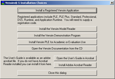 From the Installation Choices dialog select the program you want to install. If you have a registration code, click on Install a Registered Vensim Application and then enter the registration code to start the installer.