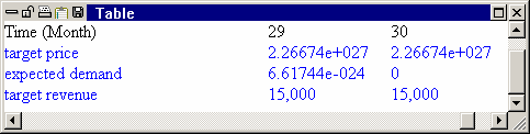 There are two things to notice about this output. First the value for target price at time 29 and 30 is the same even though the inputs are different. When an error occurs during simulation the values reported for variables that were not successfully computed will simply be those of the previous time. Second, the reason for the error is the same as it was in the previous case.