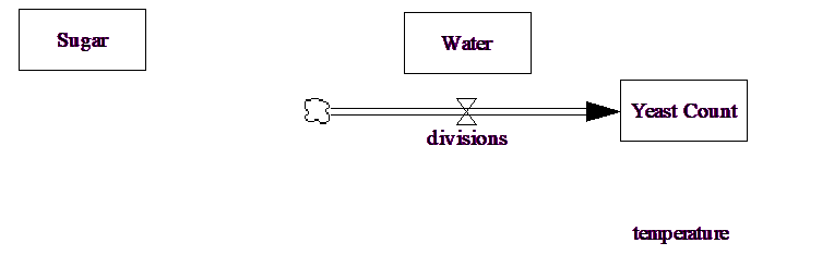 We will start the modeling process by defining the variables that we need to test our Reality Check equations and then entering our Reality Check equations. The Reality Check equations we have outlined talk about the number of yeast, the amount of water, the amount of sugar, the number of yeast divisions and temperature. Identifying levels, we put these into a skeletal model as: