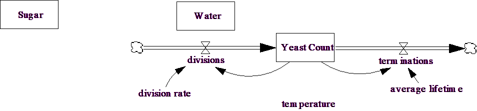 We have a short list of things we know will need to be in our model just to make it possible to use Reality Check equations. Armed with a very basic understanding of exponential growth, we can fill in our skeleton framework to build a model. Suppose we start with the simplest possible model (yeast1.mdl in UserGuide\CHAP14):