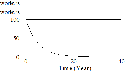 The number of workers will decrease, very quickly at first and then more slowly. This is the opposite of exponential growth where changes was slow at first and then quick and there is a similar constancy in exponential decay. If it takes, as it does here, about seven years for half the workers to leave, it will take another seven for half of those that remain to leave. It is interesting to experiment and see the relationship between average tenancy and the time it takes half the workers to leave.
