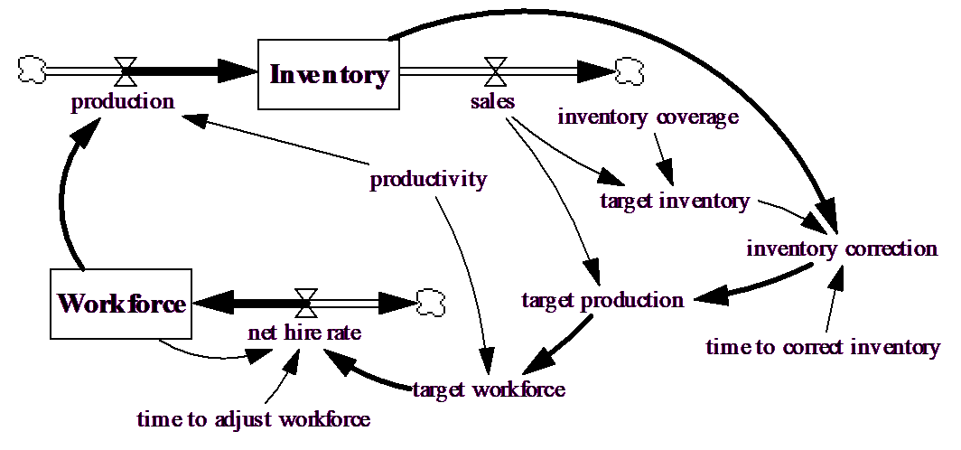 In order to refine the model we introduce target inventory, inventory correction and two additional Constants. The idea is simple — target inventory is the amount of stock that should be held based on expectations about sales. The inventory correction is the correction for a deviation of Inventory from its target. A new loop has been introduced and is highlighted.