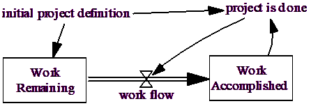 There are two reasonable ways to shut down the project model. One is simply to stop simulating when the project is done. You can do this by writing a different equation for FINAL TIME. The approach we will take here is to stop activity on project completion. We add in the concept project is done and make a connection from that to work flow.