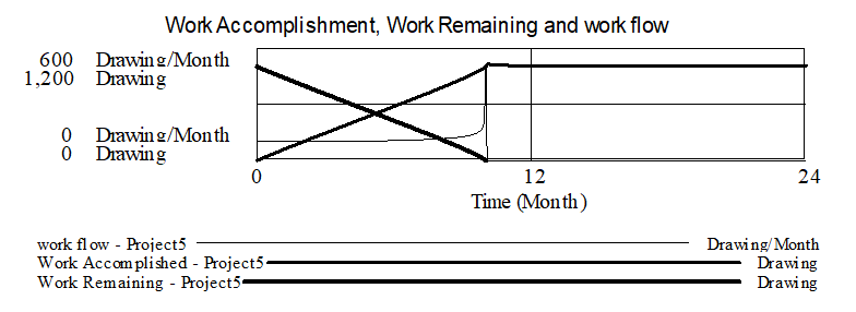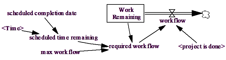 This formulation keeps required work flow less then max work flow using the MIN (minimum) function. The XIDZ (X If Divide by Zero) function divides Work Remaining by scheduledĀ timeĀ remaining unless scheduled time remaining is 0, when it returns max work flow. It is important to use this function since dividing by zero makes no sense and will be reported as an error by Vensim.