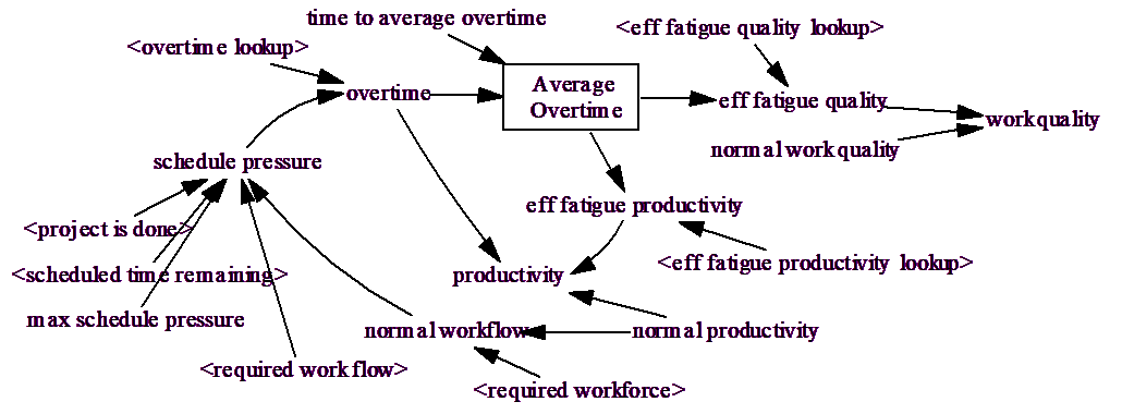 Here we use schedule pressure to drive overtime, with overtime directly affecting productivity. Average Overtime is used as a measure of fatigue resulting from prolonged overwork. Fatigue lowers productivity and quality.