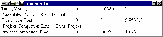 The two measurements we set up are formulated so that their terminal values are of interest. To review terminal values we will use the Table tool. Set the Time Axis tab of the Control Panel to use only a very small range (see Time Axis control in the Reference Guide). Clicking on the Table tool generates: