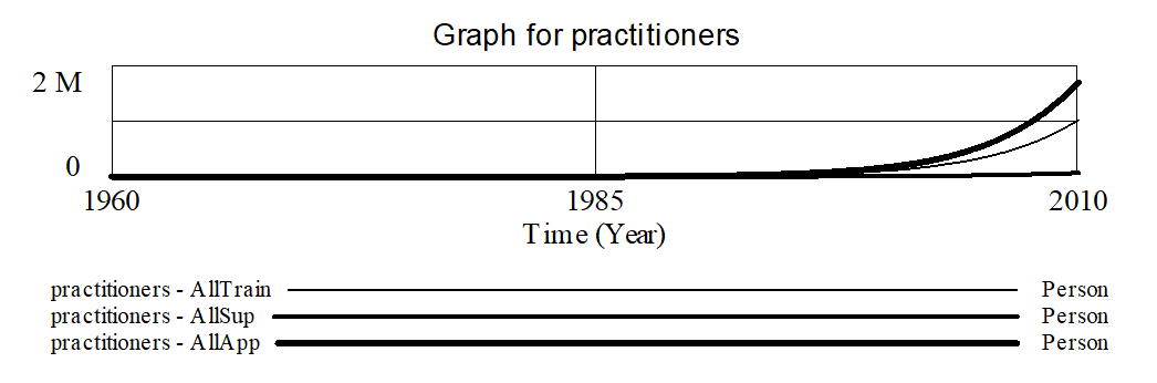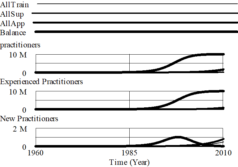 Having all practitioners spend all their time on applications (everyone learns by doing) is now the best growth strategy, but all of the growth rates are slow relative to those of the last model. The reason is simple; when only new practitioners are doing applications the quality is low and new interest is lowered. To maximize growth in this model it is necessary to get a balance between applications and teaching.