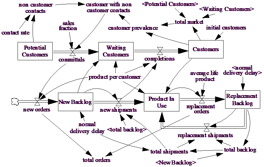 To address these issues we will set up two parallel stock and flow structures— one for customers and one for products. When a potential customer orders a product for the first time this it called a New Order. The order goes into New Backlog, and is filled over normal delivery delay to become a Product In Use. While the customer is waiting for shipment of the product, they are in the Waiting Customers pool. It is only after a new shipment occurs that customers become an active advocate of the product.