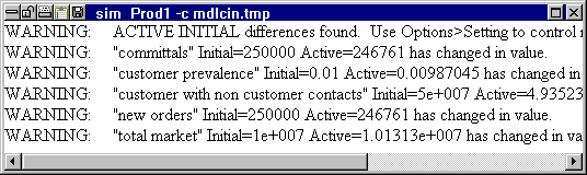 These warnings relate to the use of the ACTIVE INITIAL. The value of total market used to initialize the Levels in the model was 1E7. Once all the Levels were initialized, total market was computed with the active portion of ACTIVE INITIAL to have a value of 1.013E7. Additional variables also went through these two computations even though the ACTIVE INITIAL function was not explicitly used for them. The different values are reported. All are small changes and no real cause for concern.