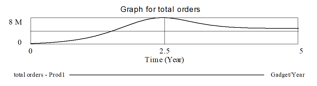 Here orders grow rapidly, but instead of falling back to 0, they go to a sustained value of just under 5 million Gadget/Year. This is the replacement demand of all the customers using the product. Because of the way the model is formulated, total products in use does not reach the value of 5 million that would occur if everyone had the product. This is because once a decision is made to replace a product, it takes time to get the replacement, so some portion of the population is always waiting to receive the product.