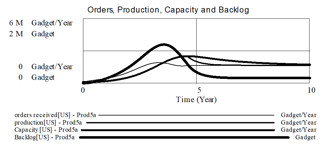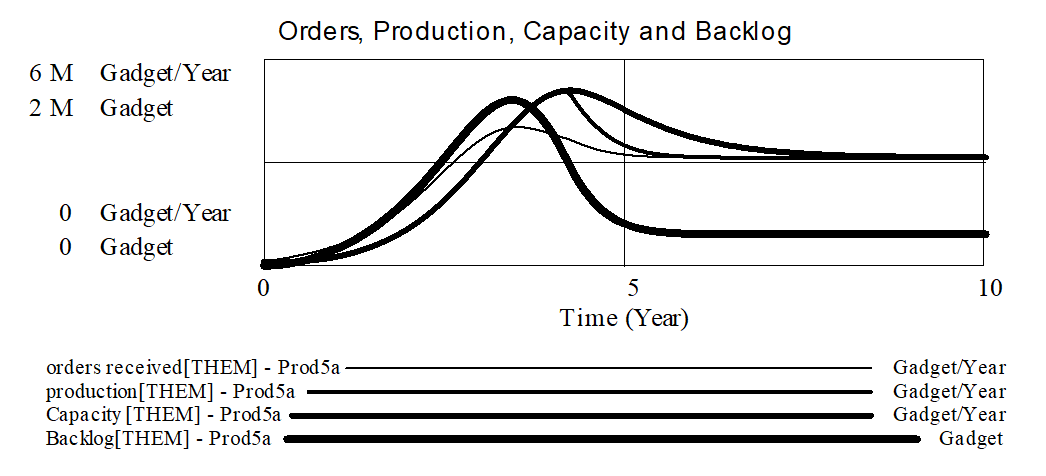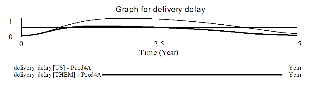 The above results show two producers, one with a huge backlog and one with a small backlog, both receiving the same number of orders. To plot the two delivery delays click on the producer tab in the Subscript Control and highlight both US and THEM (or click the All button). Now select delivery delay into the Workbench, and click on the Graph tool .