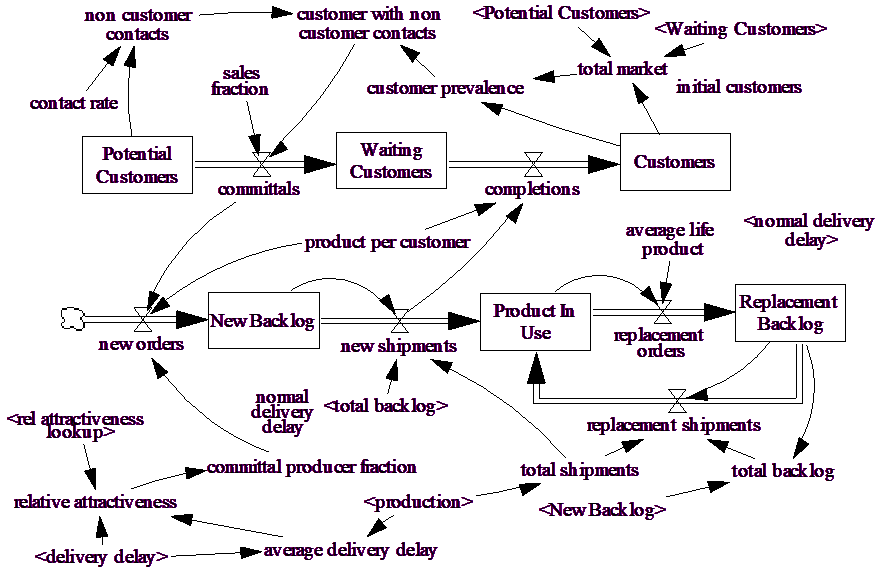 Note that initial causes have been hidden to make this diagram more readable. The new structure, shown in the lower left hand corner, determines the relative attractiveness of the two companies from delivery delay. On the basis of attractiveness, a fraction of total orders, given by the committal producer fraction, is allocated to each producer. The remaining structure is unchanged, except that Subscripts have been added to a number of the equations. The affected equations in the consumption sector are: