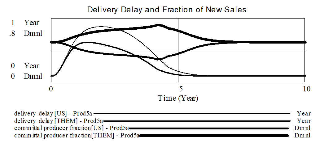 Here the simulation was run for 10 years to show the long term results. Slowing down the adjustment of capacity does very little to smooth out the adjustment process. Instead, demand shifts to the other supplier, who ends up with nearly twice the final market. In this case if we look at delivery delay and committal producer fraction for the two suppliers we see: