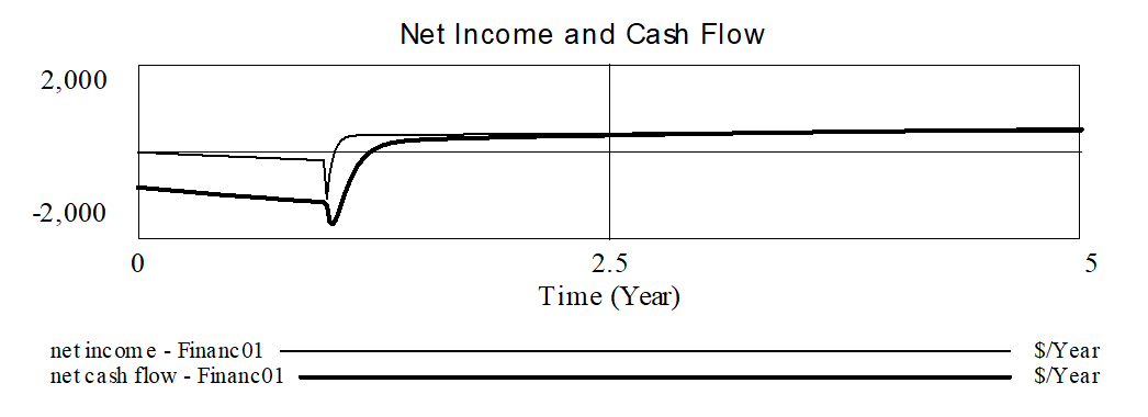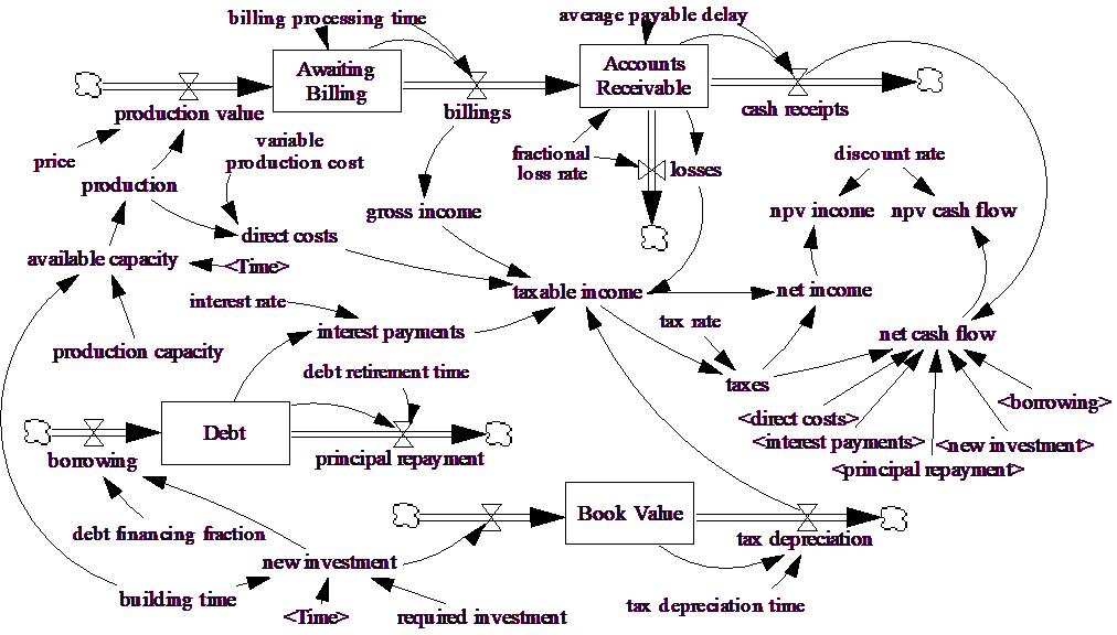We have added in two additional Levels — Debt and Book Value. If you look for feedback in this model you will find only the short draining loops around each Level. This is a dynamically simple model with a reasonably high amount of detail around the cash flow and taxable income. The way the model is set up required investment occurs over building time and then production comes on line at capacity. The model, as constructed, is for a fixed up front investment followed by a realized cash flow from production.