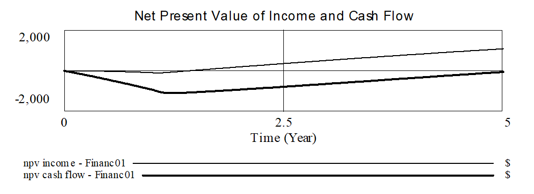 The model uses the NPV function to compute a net present value for both income and cash flow. The NPV function is a dynamic function that takes as arguments a stream of payments, a discount rate, an initial value and an adjustment factor. We are using 0 as an initial value and 1 as the adjustment factor. With these argument the NPV will, at the end of the simulation, report the present value of the stream as of the beginning of the simulation.
