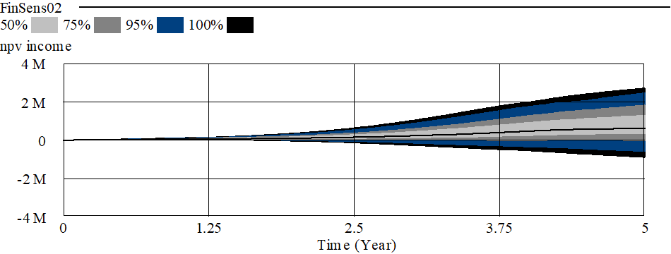 It is also possible to run sensitivity tests on this model. In this case we can consider uncertainties now only in the basic cost assumptions, but also in the basic market parameters. Using the sensitivity control file (financ02.vsc):