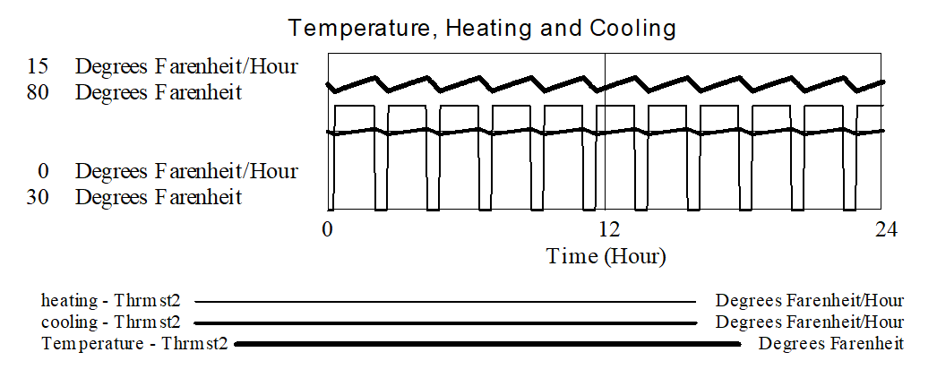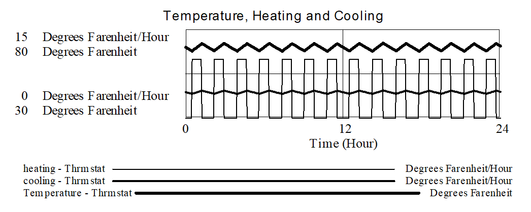 Temperature follows a sawtooth pattern over the course of the day. The rate of cooling varies modestly around a value of 4 Degrees Farenheit/Hour. The furnace switches from on for a little less than an hour and off for a somewhat longer period of time.