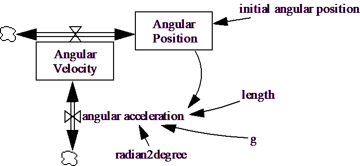 In this equation you will notice that Angular Position is converted from degrees to radians by dividing by radian2degree. The result (-sin(Θ) g/length) is then in radians and is converted back to degrees by multiplying by radian2degree.