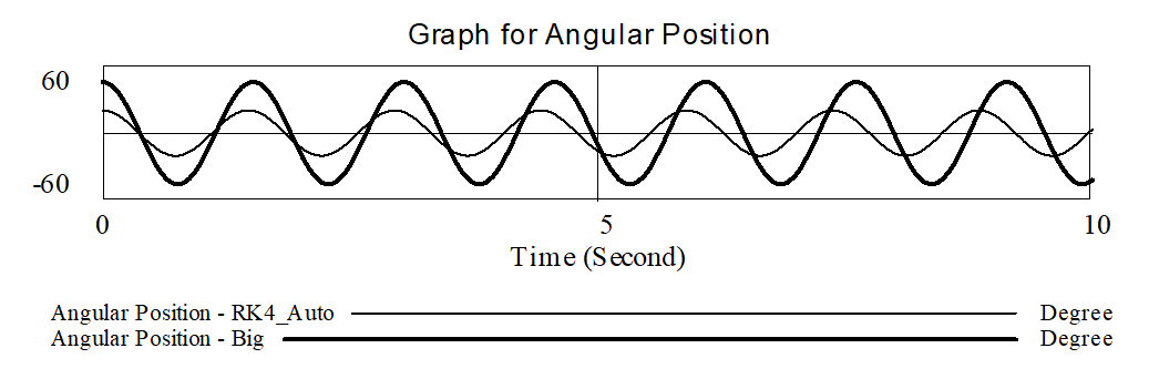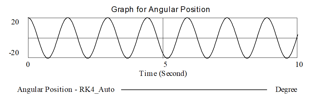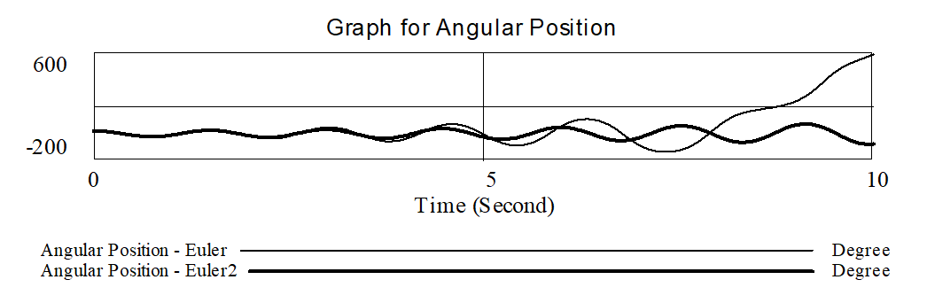 If you are puzzled, this graph says that if you raise the weight to 20 degrees and let go, the pendulum goes back and forth a few times, and then begins to spin around its axis. While this may be consistent with a child's notion of how a swing ought to work, you would be hard pressed to design a pendulum to do this. Something is wrong, and it has to do with integration.