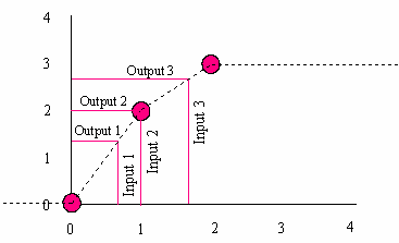 Here the dark circles represent the points on the Lookup, corresponding to ((0,0),(1,2),(2,3)). The dashed line connecting the points shows how the lookup is interpolated. The dashed lines to the right and left show that if the input is below 0, the output will be 0, and if the input is above 2, the output will be 3. Three sample inputs (.67,1,1.7) and their respective outputs (1.3,2.0,2.7) are shown.
