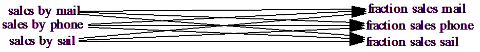 Here there are three inputs and three outputs each using all three inputs. The above diagram states that fraction sales mail depends on all three inputs, as does each of the other fractions. Though quite natural algebraically, this is quite messy visually. By putting in two junction nodes (shown as small circles) we can redraw the diagram as:
