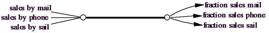 This diagram has the same meaning. Following from left to right this diagram says that all of the types of sales cause the first junction node, the first junction node causes the second junction node and the second junction node causes all of the fractions. Thus, indirectly, all of the types of sales cause all of the fractions. In determining causality Vensim simply passes through junction nodes looking for variables from which a causal path can originate.