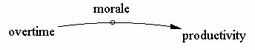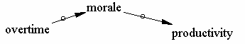 Click on the Merge tool, and then drag the handle in the middle of the arrow over morale. When you release the mouse button, the arrow from overtime to productivity is split as below: