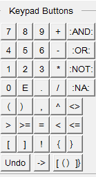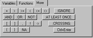 To access additional input buttons click on the More tab to the right of the number pad. This tab contains relational operators and logical keywords for use with IF THEN ELSE and SAMPLE IF TRUE. It also contains the characters contained in subscript equations (including the ! for the SUM, PROD, VMIN and VMAX functions).