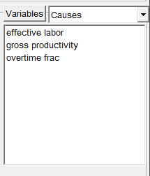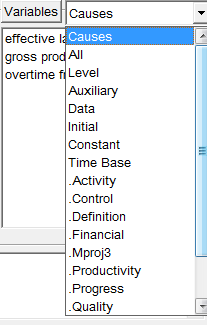 The variable list contains a selected list of variables that may be added to an equation. The user may select which variables to see by clicking on the down arrow and making a selection. The usual list would be causes, which reflects the variables that are connected to the current variable on the diagram. Other choices include All, specific variable types, and members of particular groups.