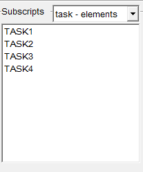 If you are creating an equation and the Equation window contains the cursor, clicking on a name in the Variables list will enter that variable at the position of the cursor. If you select a variable has subscripts, the subscripts will also appear in the equation. Thus, clicking on the name task is done in the Variable list might put task is done[task] into the equation. The appropriate Subscripts for a given variable are determined from the equations (if any) for the variable and from other equations that use the variable.
