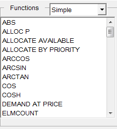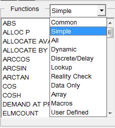 (Not PLE or PLE Plus) From the Show Class selector you can access up to nine types of functions: Common, Simple, Dynamic, Defining, Lookup, Reality Check, Macros, Data Only and User Defined. Click on the down arrow at the right of the selector to choose from the list.