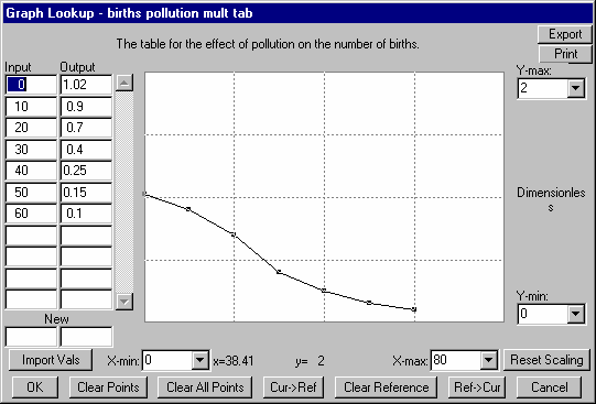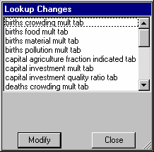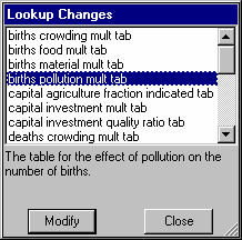 You can change Lookups interactively by clicking on the graph in the Toolbar or Lookup button on the Changes tab of the Simulation Control dialog. You will then see the Lookup Modification dialog: