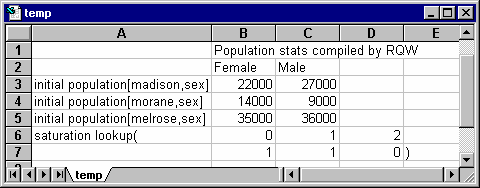 The Constants are entered in a tabular format and the Lookup is entered with its X-axis on one row and its Y-axis on another row. Note that the initial and closing parens ( ) are necessary to mark this as a Lookup for Vensim. Saving this spreadsheet as a Tab Delimited file would give: