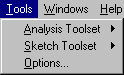 To manage toolsets, use the Tools menu item. Under this there are submenus for the Analysis Toolset and the Sketch Toolset. These submenus look the same.