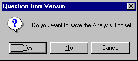 If you answer Yes, Vensim will save the Toolset with its existing name (overwriting the old Toolset), or if it is not named, query you for a name to save under.