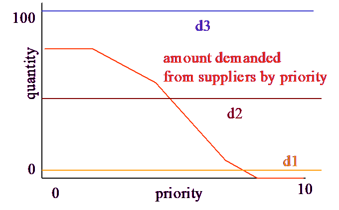 If demand is low (d1), the highest priority suppliers are used. When demand is higher (d2), more suppliers are used. If the demand is very high (d3) then all suppliers are used to their capacities.