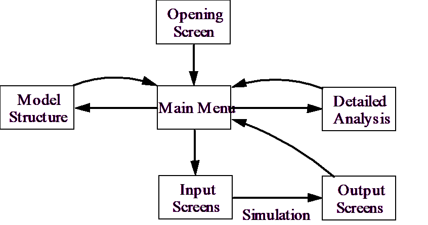 In general, you will want the user to be able to examine the model structure, to simulate the model, and to look at output data and compare this to earlier runs. This suggests something like the following structure: