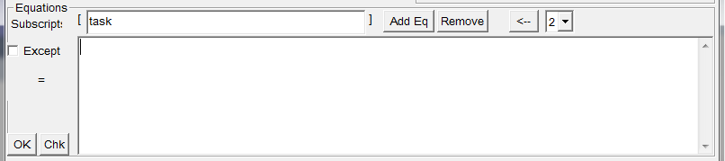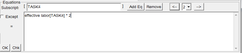 The advantage of working with subscripted variables is that one equation can represent many different elements. Nevertheless, it is sometimes desirable to have different equations. This is true if constant values differ across instances of a variable, or less commonly, if different elements have distinct structural relationships. If you open the Equation Editor on a variable with multiple equations the Title Bar will show how many equations there are and which one you are working with (such as the first of two in the diagram above). The two controls on the right allow you to move between these.