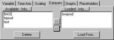 Available displays a list of datasets that are available for use but are not currently in use. This list is made up of all the dataset (.vdf) files that are in the same directory as the model with which you are working. To load an available dataset, double click on it, or click on it and then click on the >> button.
