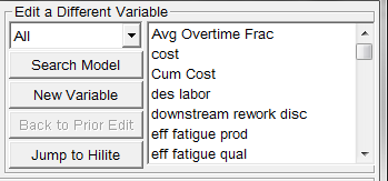 A modeler may frequently need to edit multiple variables. The Navigation feature may be used to select another variable to edit. In order to select a different variable to edit, simply click on the selected variable: By default, all model variables are displayed in the list box at the right of the dialog.