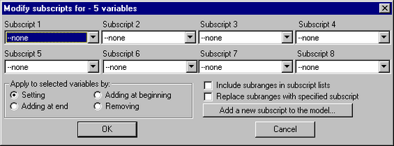 The Set Subscripts command lets you set subscripts on the selected variables. This is a convenient way to add subscripts to the model variables without having to modify individual equations. It is, of course, still possible to modify individual equations and this is often necessary when you have multiple equations for a variable or want to use a vector function.