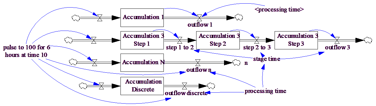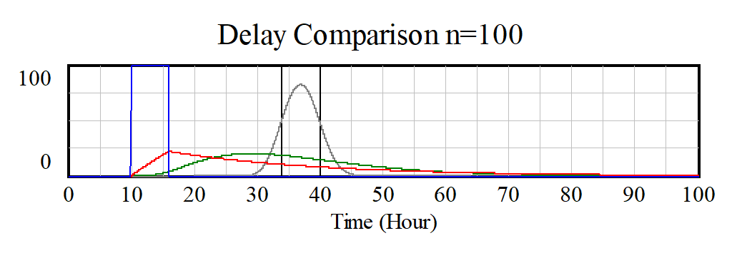 It is useful to experiment with this model, though it does become slow to simulate with large values for n. The key thing to observe is that as n increases we get closer and closer to a discrete delay, but never actually get there. Even with a 100th order delay there is a noticeable difference, though if you compare Accumulation N and Accumulation Discrete they are not much different.