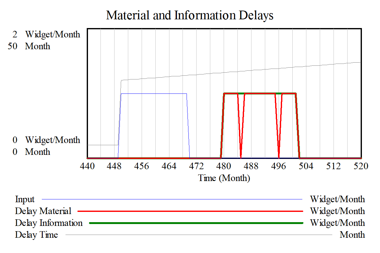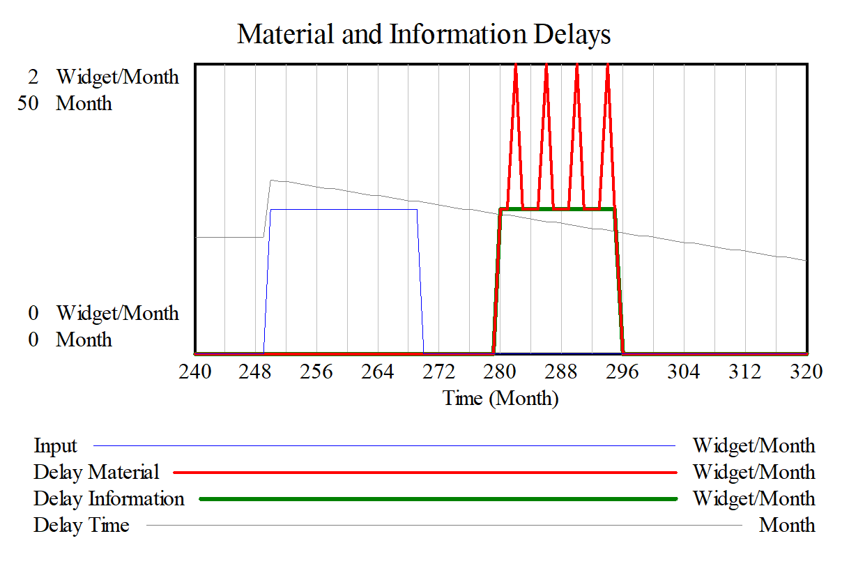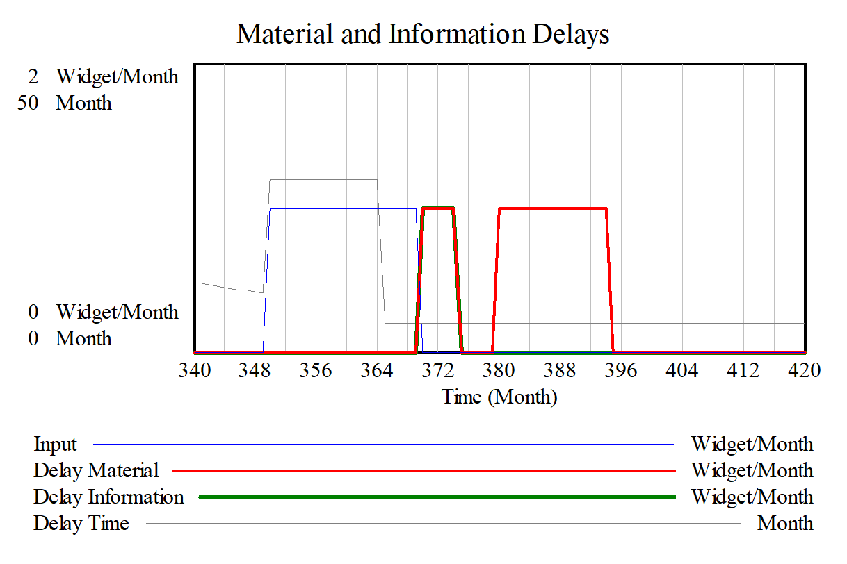 The duration of output is increased. With the material delay this means that at two times nothing comes out while the information delay simply holds constant at 1 widget/month.