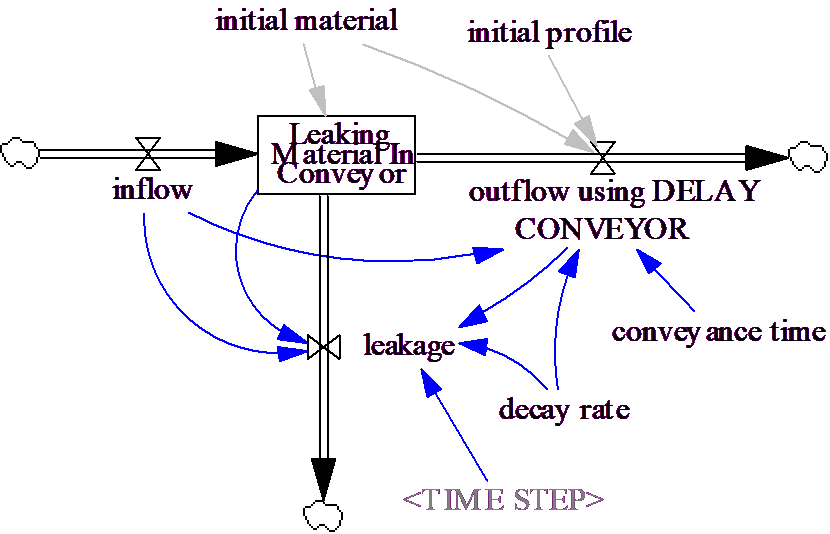 If there is leakage, however, a somewhat different structure is necessary. The leakage that occurs depends not only on the material currently in the conveyor but also on material that will be coming into the conveyor. Stated differently, if you put something on the conveyor at time 0, then by time 1 it will already have done some leaking.