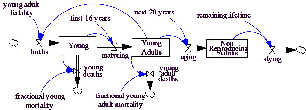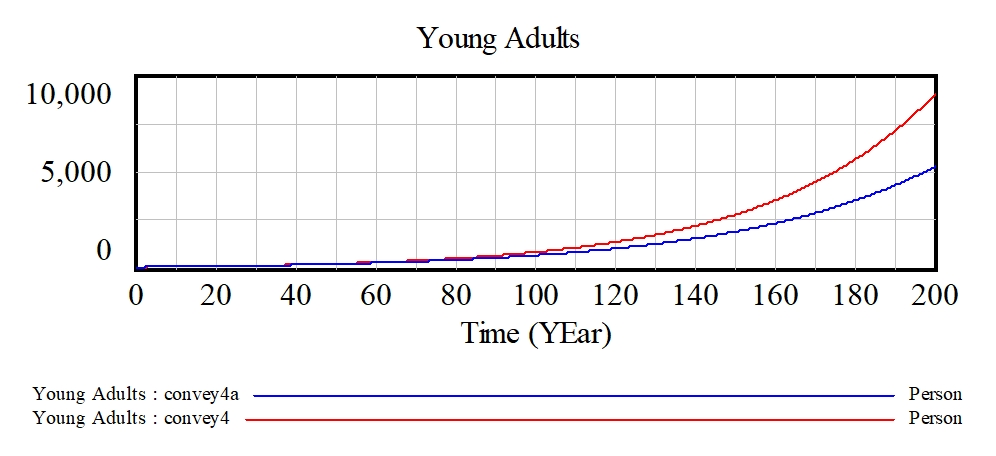 Then, because of the nature of exponential decay, an increase in births at time 0 will lead to more young adults a year later. To overcome this we can reformulate with conveyor delays as (convey4.mdl).