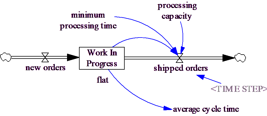 The diagram is actually nearly the same, except for the Lookup called flat and the dropping of the arrow from shipped orders to average cycle time. The changed equations are: