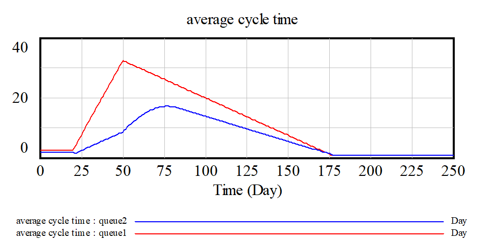 In the continuous formulation average cycle time increases from 2 to 32 in 30 days. That could only be true if nothing were being produced and all the orders were place at time 20. The formulation using QUEUE provides a more accurate answer.