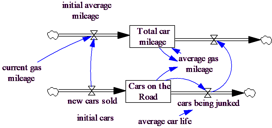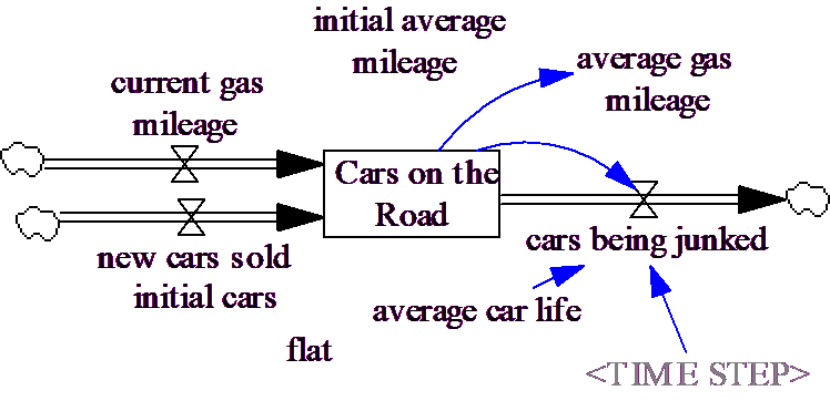 We have removed the abstract level total car mileage, and now show two flows into Cars on the Road. One of these flows is really the flow of an attribute, but this seems the clearest representation. The equation for Cars on the Road becomes: