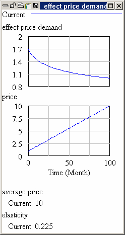 If we make changes to elasticity and run the whole model price and average price will both move and it will be difficult to see the effect of price on for different prices. However by overriding the behavior of price to be a ramp, and freezing the levels we have isolated the structure so that we can study its local behavior. Normally you will be able to use Strip Graphs to study these relationships.
